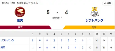 【楽天対ソフトバンク3回戦】楽天が連敗を4で止め、今季本拠地初勝利 中島大輔が初回先頭弾、決勝打の村林一輝は4の4 ソフトバンクは開幕からの連勝5でストップ
