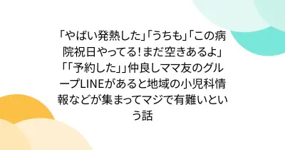 「やばい発熱した」「うちも」「この病院祝日やってる!まだ空きあるよ」「「予約した」」仲良しママ友のグループLINEがあると地域の小児科情報などが集まってマジで有難いという話