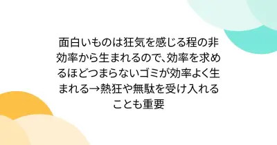 面白いものは狂気を感じる程の非効率から生まれるので、効率を求めるほどつまらないゴミが効率よく生まれる→熱狂や無駄を受け入れることも重要