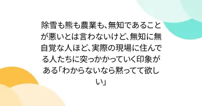 除雪も熊も農業も、無知であることが悪いとは言わないけど、無知に無自覚な人ほど、実際の現場に住んでる人たちに突っかかっていく印象がある「わからないなら黙ってて欲しい」