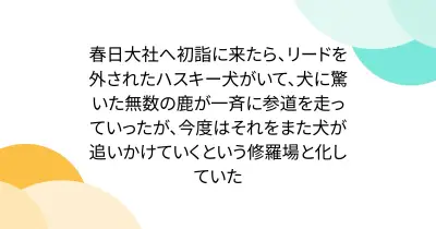 春日大社へ初詣に来たら、リードを外されたハスキー犬がいて、犬に驚いた無数の鹿が一斉に参道を走っていったが、今度はそれをまた犬が追いかけていくという修羅場と化していた