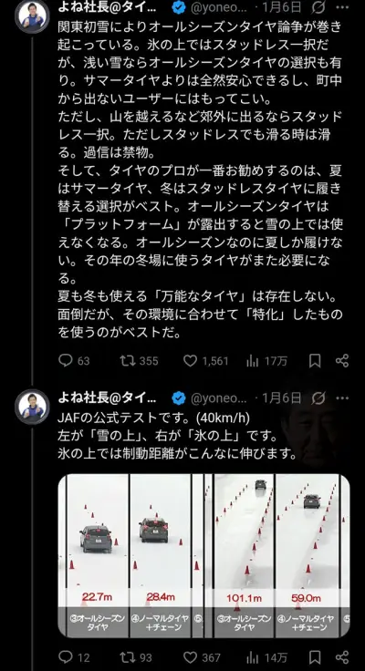 タイヤ屋社長「氷の上ならスタッドレス一択」→そして、レスバへ