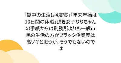 「獄中の生活は4度寝」「年末年始は10日間の休暇」頂き女子りりちゃんの手紙からは刑務所よりも一般市民の生活の方がブラック企業度は高い?と思うが、そうでもないのでは