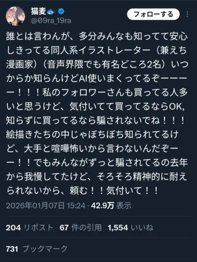 【速報】大手絵師「あの大物絵師がAIを使ってる!頼むみんな気づいてくれえええ! 騙されないで!!!」