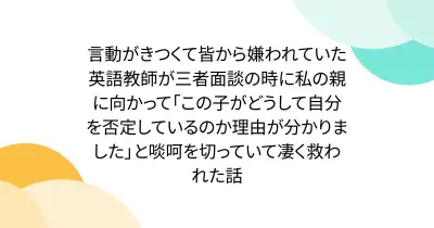 言動がきつくて皆から嫌われていた英語教師が三者面談の時に私の親に向かって「この子がどうして自分を否定しているのか理由が分かりました」と啖呵を切っていて凄く救われた話