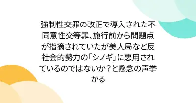 強制性交罪の改正で導入された不同意性交等罪、施行前から問題点が指摘されていたが美人局など反社会的勢力の「シノギ」に悪用されているのではないか?と懸念の声挙がる