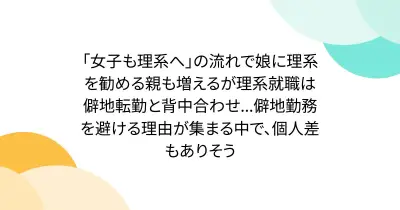 「女子も理系へ」の流れで娘に理系を勧める親も増えるが理系就職は僻地転勤と背中合わせ...僻地勤務を避ける理由が集まる中で、個人差もありそう