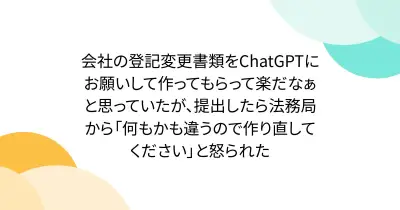 会社の登記変更書類をChatGPTにお願いして作ってもらって楽だなぁと思っていたが、提出したら法務局から「何もかも違うので作り直してください」と怒られた