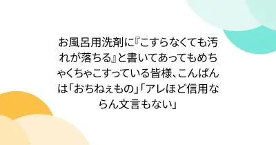お風呂用洗剤に『こすらなくても汚れが落ちる』と書いてあってもめちゃくちゃこすっている皆様、こんばんは「おちねぇもの」「アレほど信用ならん文言もない」