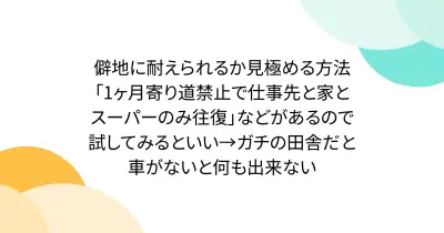 僻地に耐えられるか見極める方法「1ヶ月寄り道禁止で仕事先と家とスーパーのみ往復」などがあるので試してみるといい→ガチの田舎だと車がないと何も出来ない