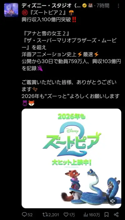 ズートピア2興収100億突破、洋画アニメ史上最速www