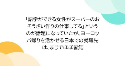 「語学ができる女性がスーパーのおそうざい作りの仕事してる」というのが話題になっていたが、ヨーロッパ帰りを活かせる日本での就職先は、まじでほぼ皆無