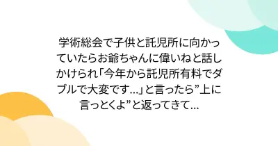 学術総会で子供と託児所に向かっていたらお爺ちゃんに偉いねと話しかけられ「今年から託児所有料でダブルで大変です...」と言ったら”上に言っとくよ”と返ってきて...