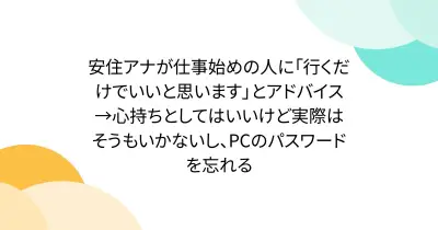 安住アナが仕事始めの人に「行くだけでいいと思います」とアドバイス→心持ちとしてはいいけど実際はそうもいかないし、PCのパスワードを忘れる