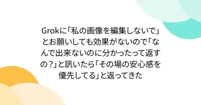 Grokに「私の画像を編集しないで」とお願いしても効果がないので「なんで出来ないのに分かったって返すの?」と訊いたら「その場の安心感を優先してる」と返ってきた