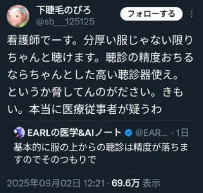 【ダブスタ】自称看護師「服の上から聴診器?分厚い服じゃない限りちゃんと聴けます」→「既往がある人はそら服めくって聴診しますわ」