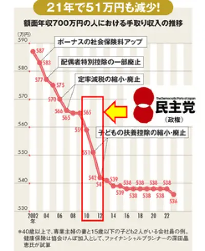 【赤っ恥】サヨク「ずーっと手取りを減らされ貧乏にされてるのに自民党を何故支持できるか教えて」民主党政権で手取り激減したグラフ添付してセルフ論破wwwww