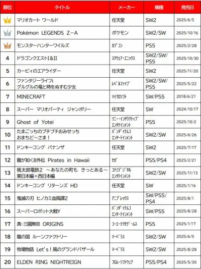 2025年11月ソフト・ハード売上ランキング公開。Switch 2本体は約50万台販売