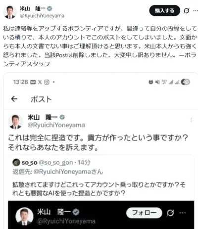 米山隆一さん、自演疑惑はスタッフのミスであったと謝罪