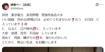 林家ぺー、自宅が停電3日目…電力会社に訴え「いじめるのはやめてくれませんか?」