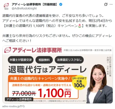 アディーレ法律事務所、モームリ社長逮捕を受け退職代行格安キャンペーンをはじめる