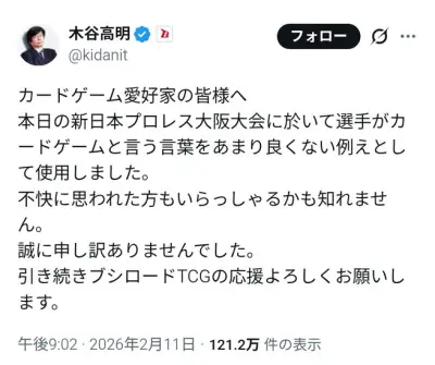 新日本プロレスオーナー「カードゲーム愛好家へ。選手がカードゲームをバカにしてしまい誠にごめんなさい」