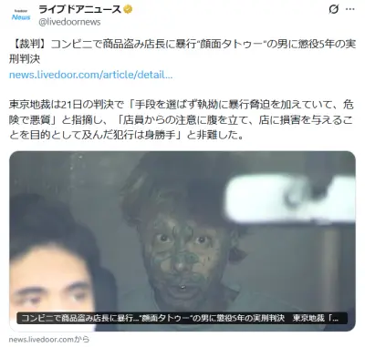 万引き見つかってコンビニ店員を殴った顔面タトゥーの男、懲役5年の実際判決