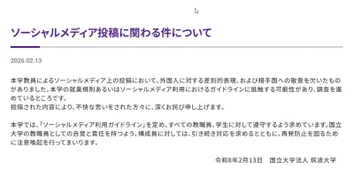 【速報】筑波大教員「日本の大学に来る外国人はだいたい能力が低く、トラブルメーカーが多い」筑波大、不適切な投稿だとしてホームページに謝罪