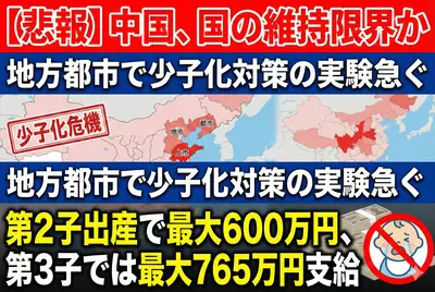 【悲報】中国、国の維持限界か 地方都市で少子化対策の実験急ぐ「第2子出産で最大600万円、第3子では最大765万円支給」