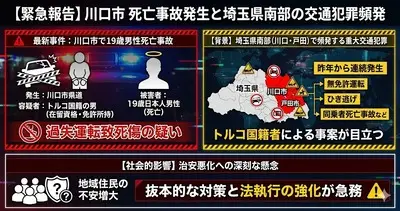 【川口】トルコ国籍の29歳解体業、バイク19歳をはねて死なせ逮捕「間違いない」 産経新聞「同県南部ではトルコ国籍者による交通死亡事故が相次いでいる」