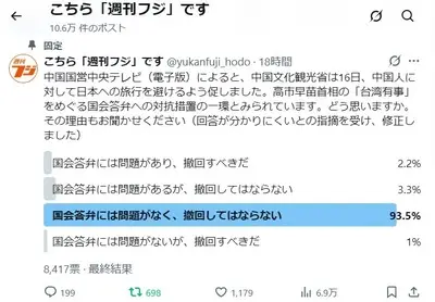 【朗報】Xでは「高市発言は問題なし。野党や中国が悪い」脅威の93.5%!パヨちんはアンイストールで徹底抗戦だ!