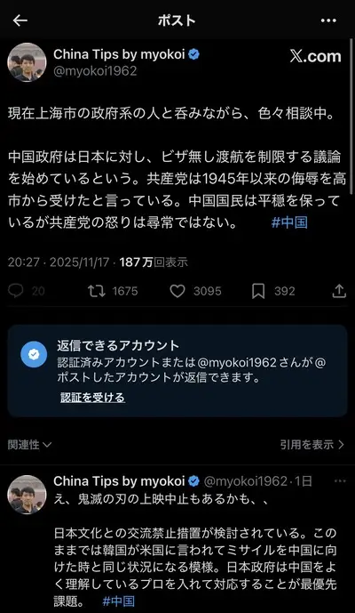 【速報】中国「私たちが怒っているのは高市政権であり、日本国民や法人はこれまで通り歓迎する」日本国民「騒動後も高市政権の支持率は65%で、民意です」