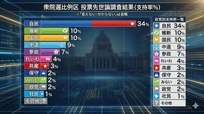 【速報】比例投票先、自民34%、中道9%、国民10%、維新10%