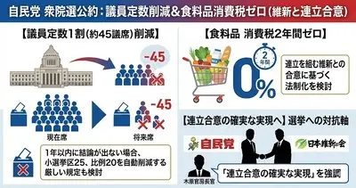 【勝確】暫定的な自民公約が判明「衆院議員定数1割削減明記」「食料品の消費税ゼロ」1年以内に結論が出ない場合は小選25、比例20の削減が自動確定する規定も