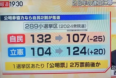 【選挙予想】自民199→260 立憲148→70 維新34→38 国民27→35 公明24→18