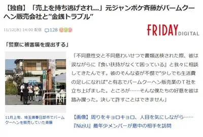 【速報】元ジャンポケ斉藤、今度は売上金を業務上横領か バームクーヘン販売会社「警察に被害届を提出する予定です」斉藤「報酬が支払われていないから送金しない」