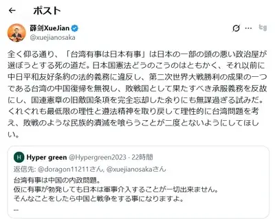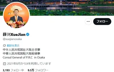 【速報】中国の駐大阪総領事、問題投稿を削除→新投稿「台湾介入は日本の一部の頭の悪い政治屋が選ぼうとする死の道だ」「中日平和友好条約の法的義務に違反」