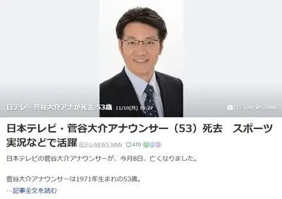 【悲報】日本テレビ菅谷大介アナが急死53歳 7日夜、勤務を終えた帰宅後、容体急変