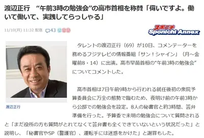 【速報】渡辺正行、午前3時勉強会の高市首相を称賛偉いですよ。働いて働いて、実践してらっしゃる」ラサール石井「・・・」