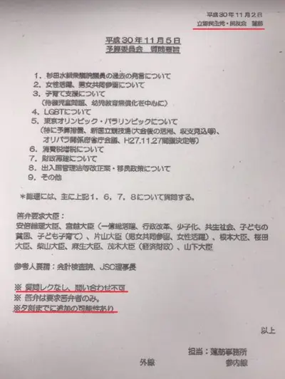 どんな立派な質問通告書を作っているのか→立憲・蓮舫「問い合わせ不可・追加の可能性」森ゆうこ「質問タイトルのみ」有田芳生「1行のみ」玉木議員「模範的」