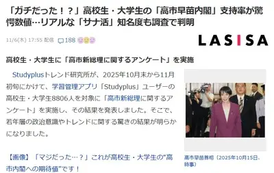 【速報】高校生・大学生の高市政権支持率が驚異の93.5% 最重要政策は「国際関係・安全保障と物価高」流行語「サナ活」の知名度は4割
