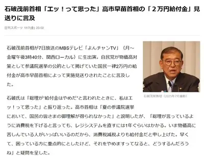 石破茂前首相、テレビ生出演「(高市首相の2万円給付金見送りに)」5ch「えっ?お前が出さないってまず言い始めたじゃん」