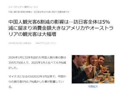 【速報】中国人観光客6割減の影響は訪日客全体の5%減に留まる「中国人観光客不要は時間なの問題、報復ダメージは軽微!消費金額大きな米豪観光客は大幅増」