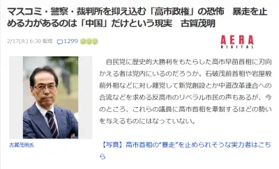 【速報】Yahooニュース「恐怖の高市政権がマスコミ・警察・裁判所を抑え込む 高市首相の暴走を止める力があるのは中国様だけという現実」