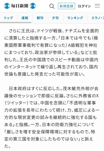 【速報】中国外相の日本批判 欧米からもボコボコ「現実離れ」「プロパガンダに過ぎない」、日本では毎日新聞からも見捨てせれた!?