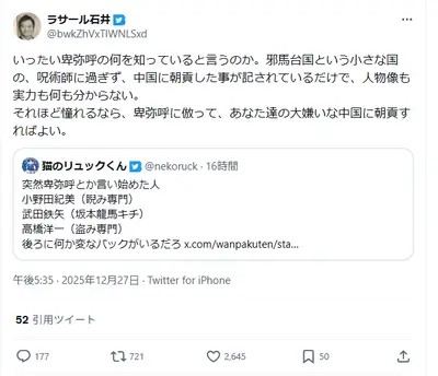 【悲報】ラサール石井「小野田さん達さぁ、そんなに卑弥呼好きなら大嫌いな中国に朝貢しなよ」
