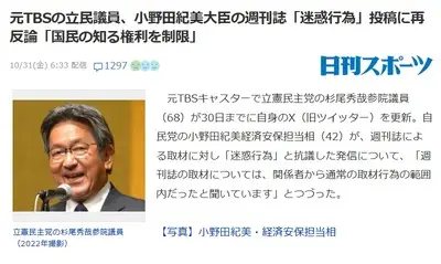 【は?】小野田「(拒否している地元同級生への)週刊新潮の取材は気持ち悪い」に元TBS立憲杉尾氏が再反論「国民の知る権利を制限!」