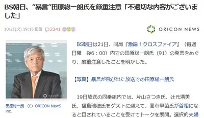 【速報】BS朝日、田原総一朗氏の「あんな奴は死んでしまえ」発言を厳重注意「不適切な内容がございました」