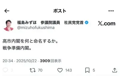 【速報】社民党・福島みずほ、「戦争準備内閣」と命名発表