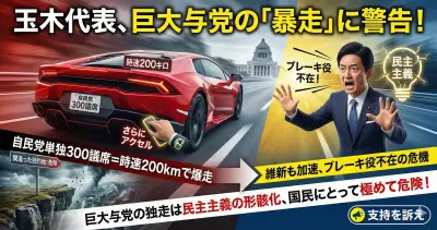 【速報】国民民主党の玉木氏「自民党単独で300議席を取ったら、時速200キロで爆走すると思う」